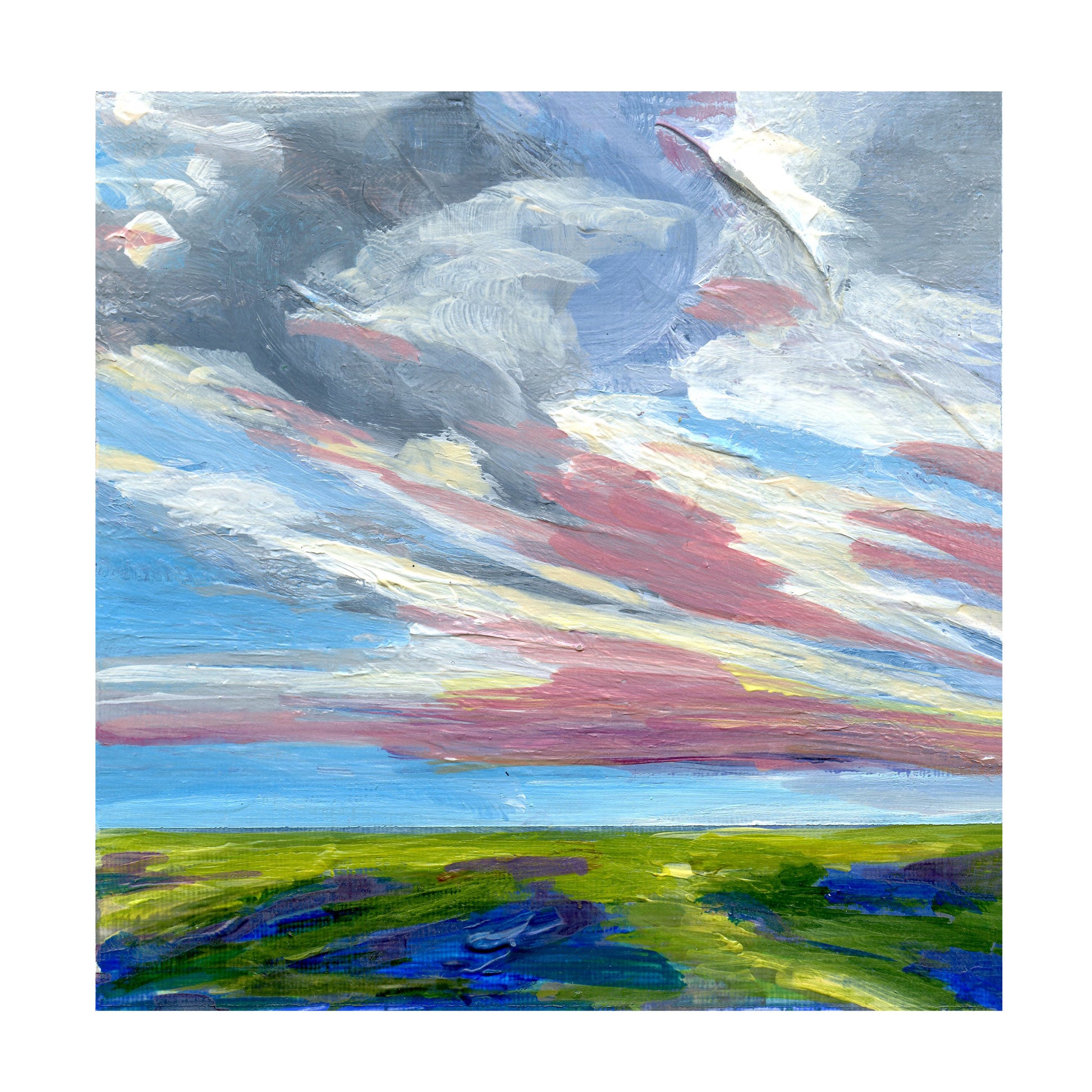 This is a very small 10cm x 10 cm study of a changing sky. It is part of a series of 5 and is preparatory work for a larger series of paintings. It is painted in acrylic without the use of mediums to explore both colour and form in a more graphic style.