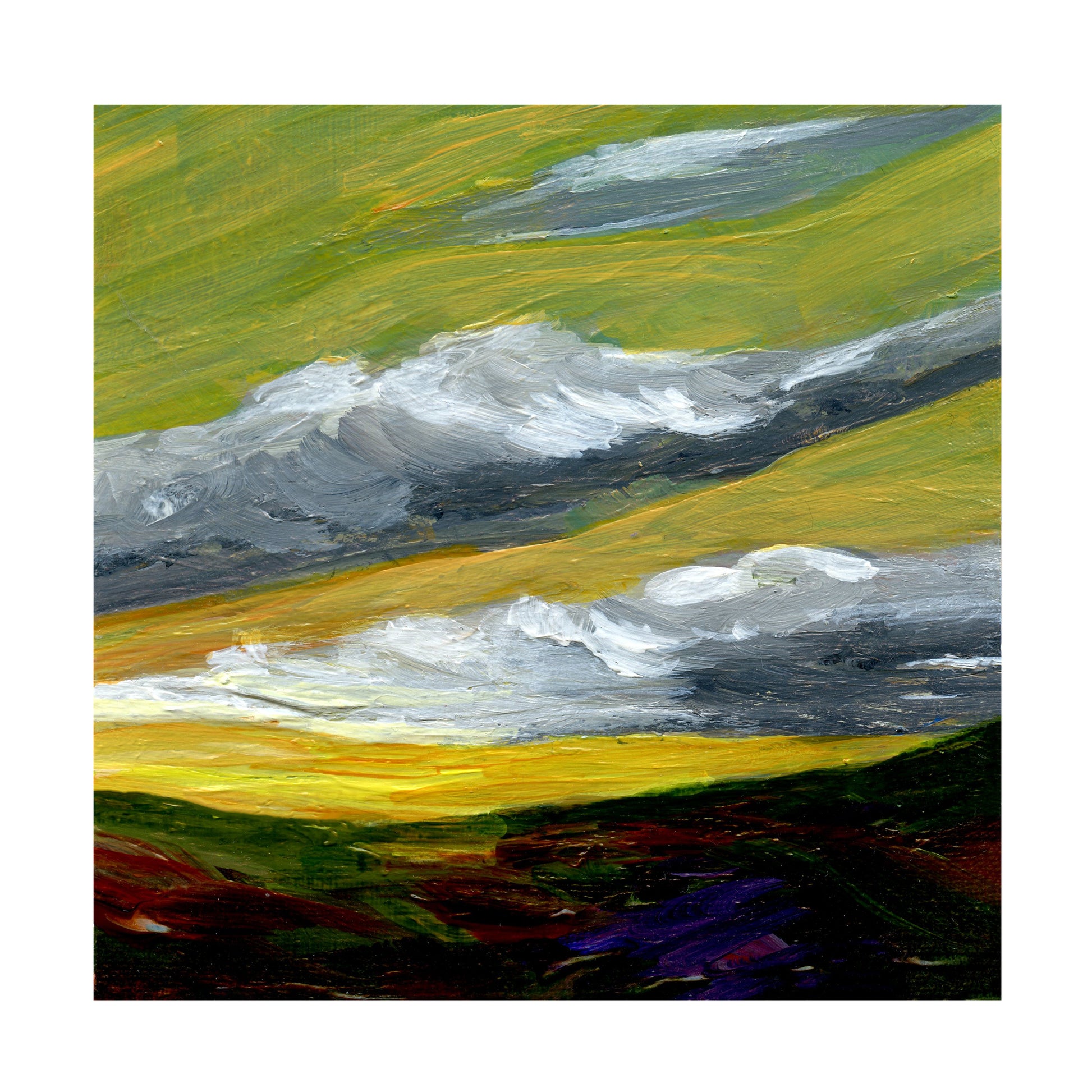 This is a very small 10cm x 10 cm study of a changing sky. It is part of a series of 5 and is preparatory work for a larger series of paintings. It is painted in acrylic without the use of mediums to explore both colour and form in a more graphic style.